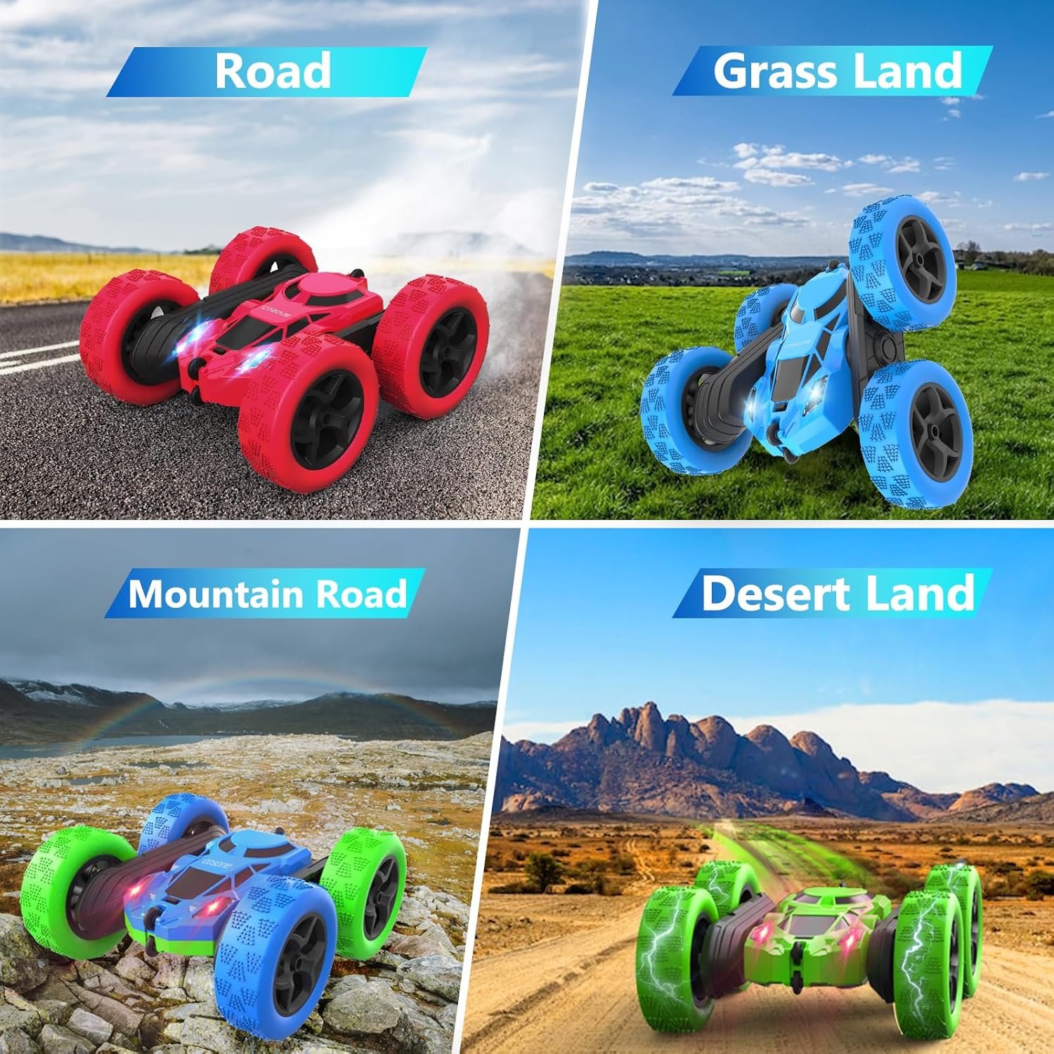VERSATILE PLAYING OPTIONS: With its 360° rotating stunt capabilities, this race car can be played indoors or outdoors, on different surfaces such as grass, sand, or even rocky terrain. Double sides running, moving forward, backward, turning left, right, double side roll, 180-degree tumbler flip and 360-degree spin for a different playing experience. Each 500mAh rechargeable battery supports the electric car playing for about 25mins.