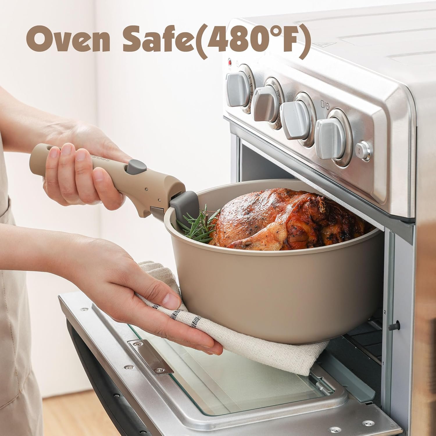 The stackable design saves up to 70% of space and can be easily stored in cabinets, RVs, travel trailer and the removable handles provide good flexibility, allowing you to easily move cookware from oven to table, fridge to stovetop.