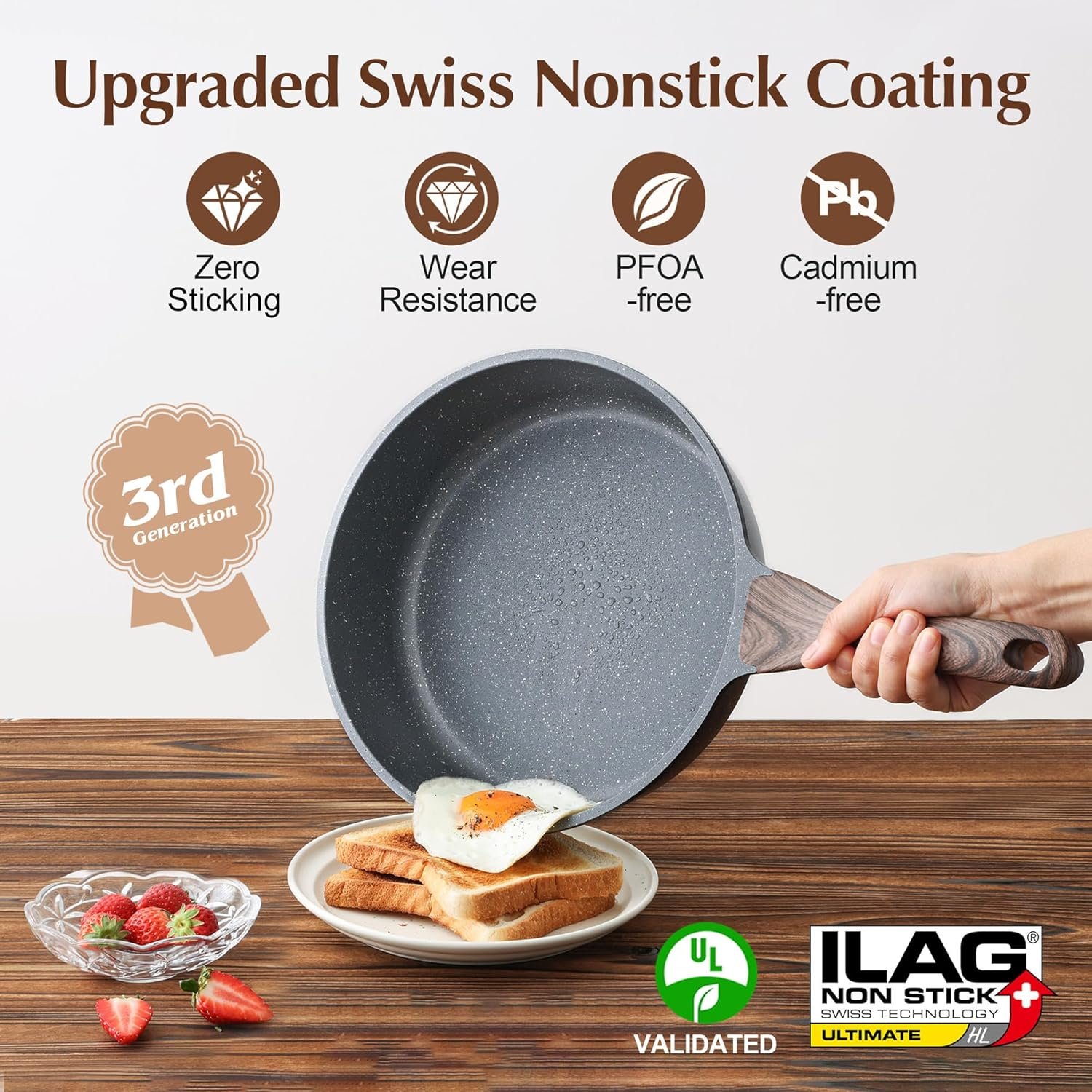 20 Years Premium Quality focus on nonstick cookware.Healthy Swiss ILAG Granite Coating – super non-stick, free of PFOA, lead, and cadmium, everyone can make a healthy meal full of flavor with less oil; Cleaning is also a breeze;Recycled Aluminum Bodies – these pots and pans are made from recycled aluminum and reinforced with wobble-free bases for extra strength and even heating. Designed to perform perfectly on gas and electric stovetops.Service Utmost – 100% Responding within 24 Hours.