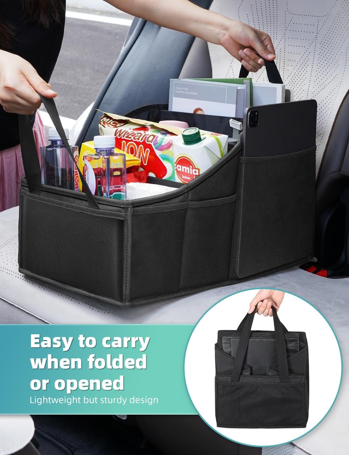 Collapsible with two handles: this car organizer can be folded as large as a laptop bag and stored in the car trunk when not in use or hung with handles for saving space; sturdy woven handles make it easier to carry around in and out of your car
