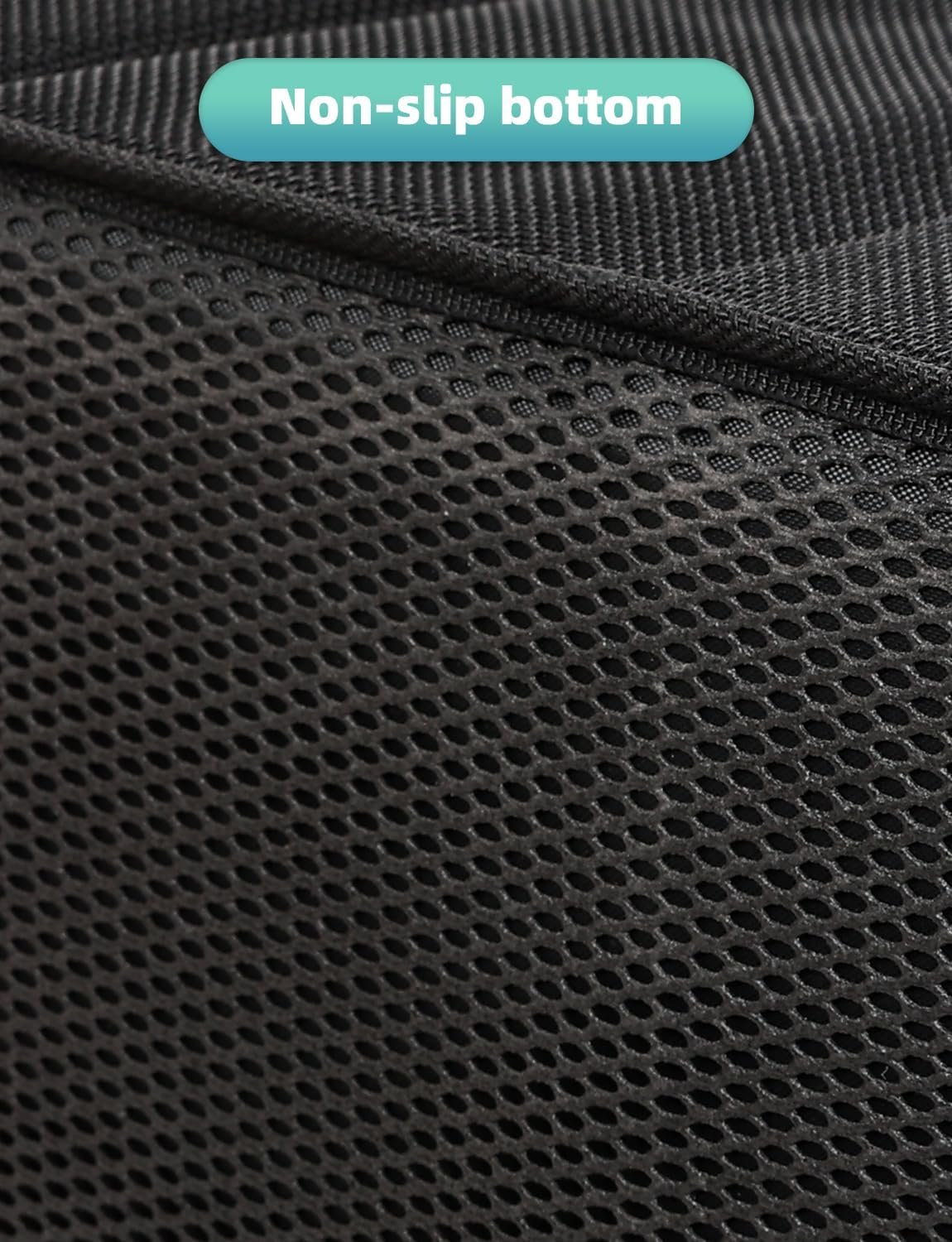 Dual non-slip design: non-slip net on the bottom keeps the organizer in place; also you can secure it with your car seat belt while driving, because there are loops on the back to run a seatbelt through and hold it in place